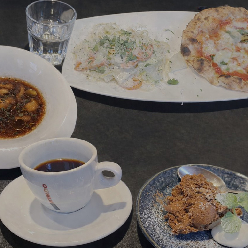 ランチはパスタとピザのメニューから2種類または3種類を選べるスタイルで、今回は2種類+ドルチェセットにしました。ピザはマルゲリータ、パスタは季節野菜のホワイトソース。大きなお皿に一緒に盛られて提供され、小さめとはいえしっかりボリュームがあり、お腹いっぱいに。